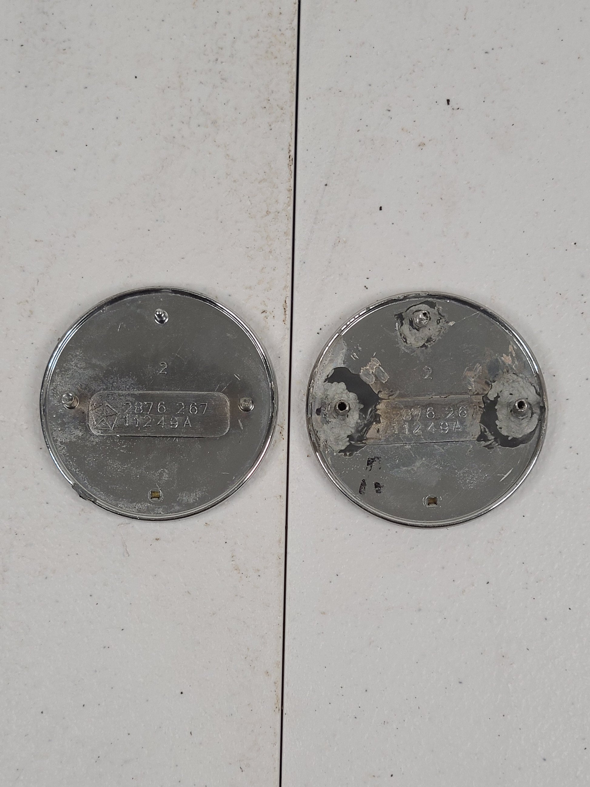 USED 1968-1970 Dodge Charger Upper Door Pad Medalions/Emblems. Both faces of the medalions are in good condition. Have small scratches and scuffs. May come out with some polishing. The back mounting nipples on one are perfectly intact. the other one has been broken and epoxied back on.