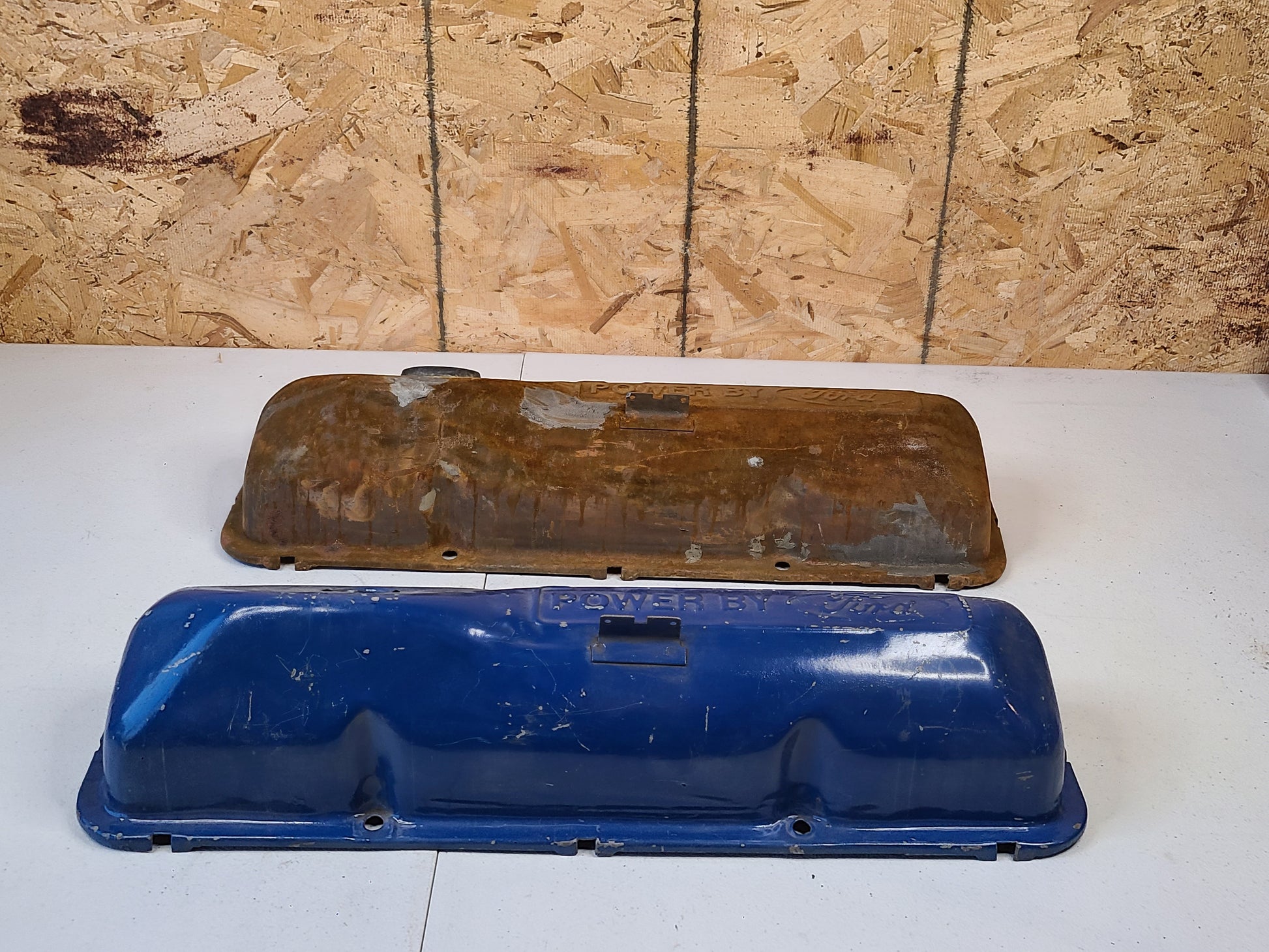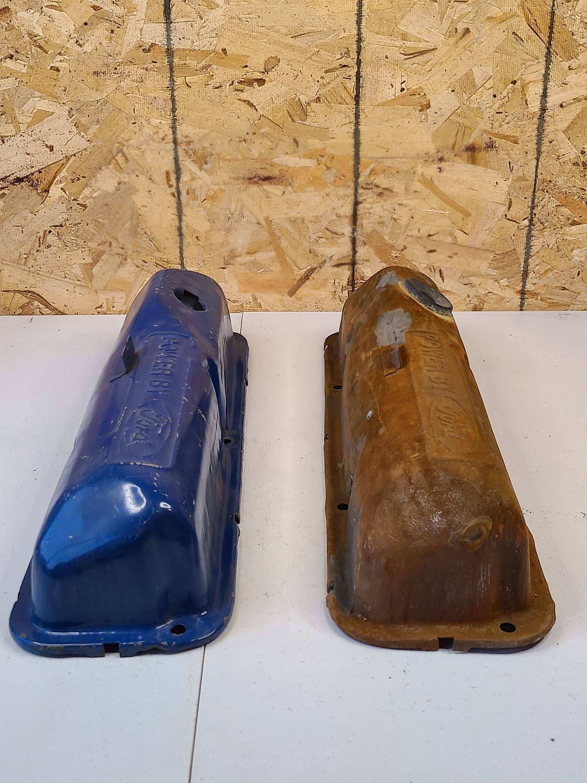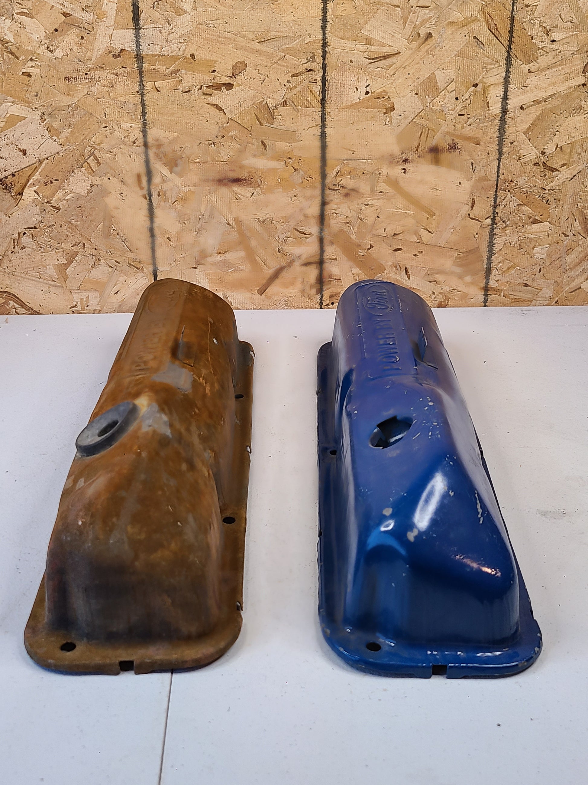 USED 1968-1976 Ford FE Big Block "Powered By Ford" Valve Covers. Sold as a pair. The painted valve cover is in good usable condition. A quick clean up would all it would take to be put into use. It doesnt have any holes, dents, gouges, or cracks. Some of the paint is scratched off. The rusty one is trashed. A good wall hanger. It has holes rusted through it most are covered with epoxy. Also has pitting as seen in the pictures.