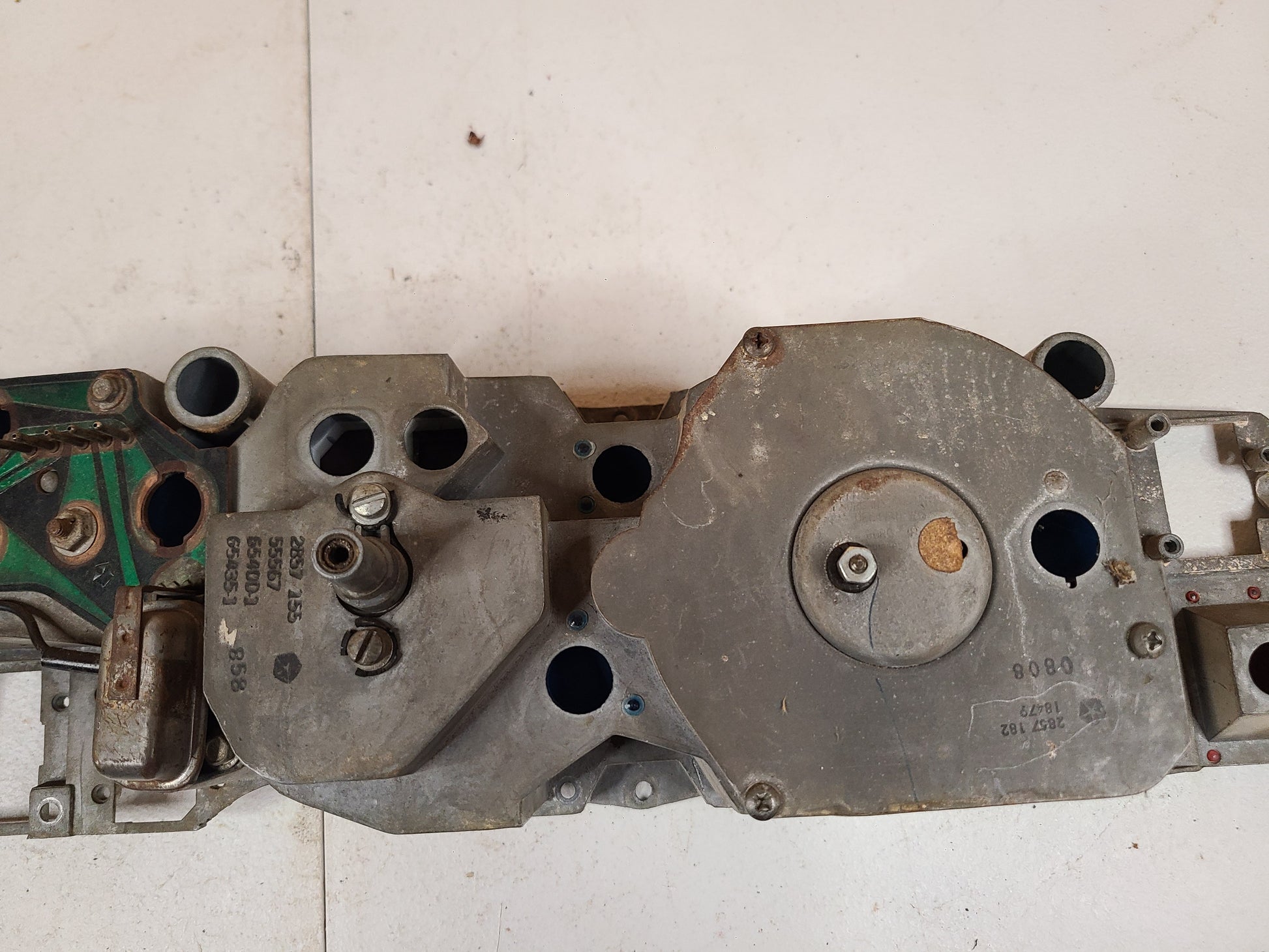 USED 1968 Dodge Charger Rallye Guage Cluster Part# 2857158. Dash is a good restorable unit. Does not have any broken pins on the back, or broken studs off of gauges. Dash does not have any broken or cracked mounting holes or tabs. Guage lenses are scuffed and gauge faces are yellowed.